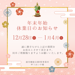 今年もたくさんの方々にお世話になりました!利用者さんたちも忙しい中、毎日楽しく作業をしてくださって本当にありがとうございます♪明日まで職員一同精一杯支援していきますね☆